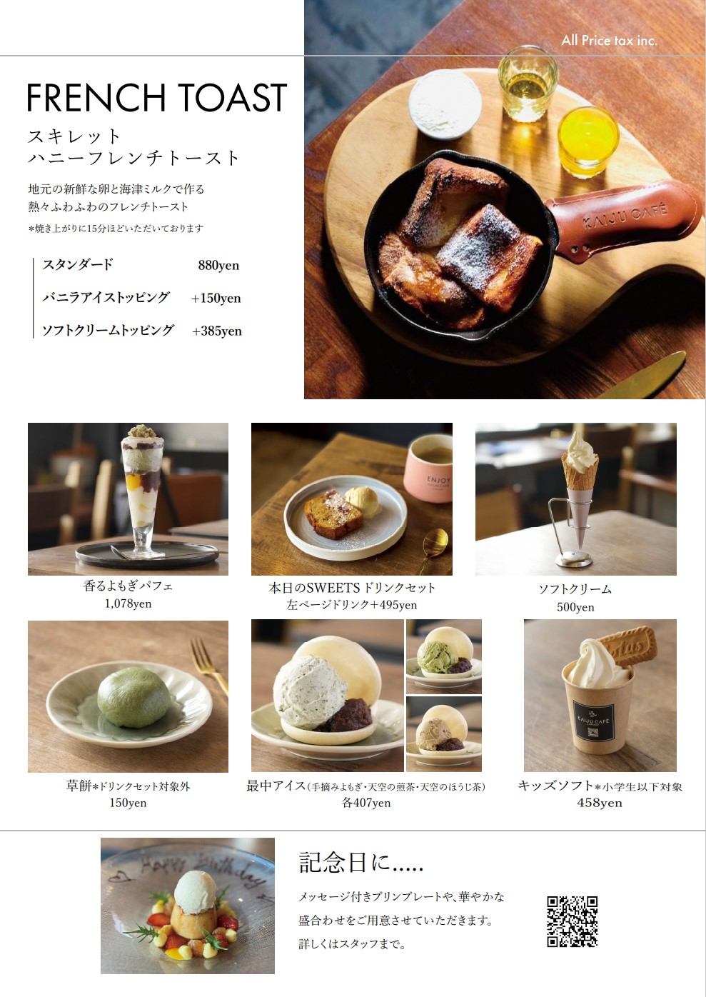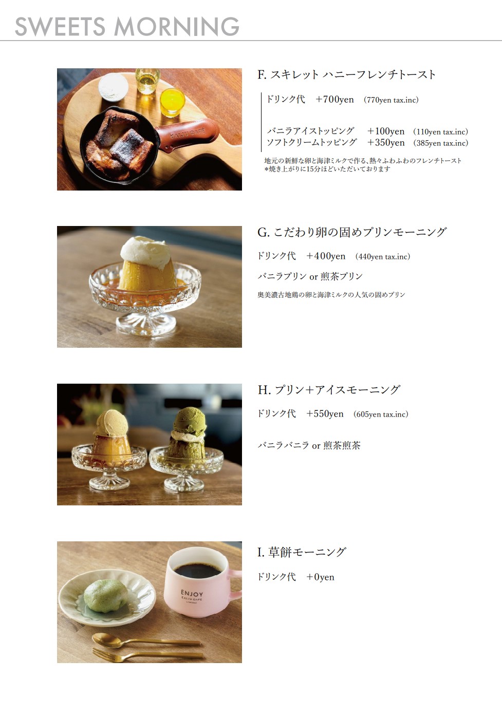 海津が訛ってカイジュウです... KAIJU CAFE(カイジュウカフェ)では、地産地消や地方発信をテーマに料理やデザートをお楽しみいただけます。 モーニングのおすすめは草餅モーニング(11:00まで)。ドリンク代のみで草餅がセットになります。 ランチ(14:00まで)はジビエのハンバーグやホットドッグが人気。海津のお野菜がたっぷり楽しめるランチセットがおすすめです。 カフェスイーツは奥美濃古地鶏のたまごの固めのプリンやよもぎパフェが人気です。テイクアウトのソフトクリームも海津産ミルク100%。 海津でENJOY&RELAX