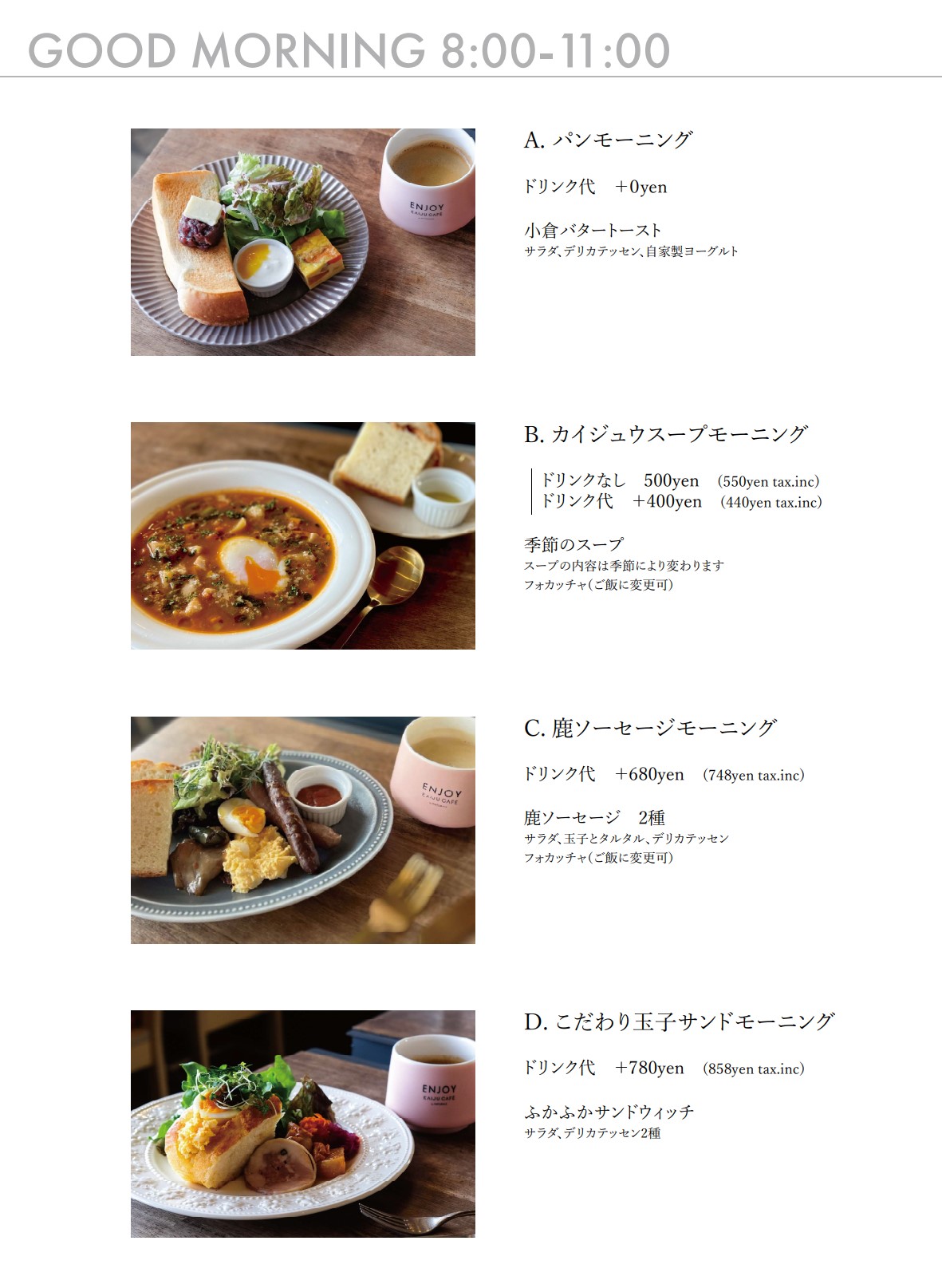 海津が訛ってカイジュウです... KAIJU CAFE(カイジュウカフェ)では、地産地消や地方発信をテーマに料理やデザートをお楽しみいただけます。 モーニングのおすすめは草餅モーニング(11:00まで)。ドリンク代のみで草餅がセットになります。 ランチ(14:00まで)はジビエのハンバーグやホットドッグが人気。海津のお野菜がたっぷり楽しめるランチセットがおすすめです。 カフェスイーツは奥美濃古地鶏のたまごの固めのプリンやよもぎパフェが人気です。テイクアウトのソフトクリームも海津産ミルク100%。 海津でENJOY&RELAX